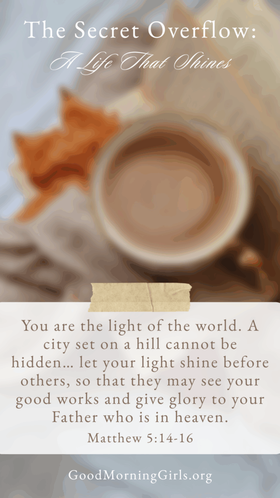 Mild a candle in your house each evening and pray for His like to shine via you. Do one hidden act of kindness this weekβwith out recognitionβas a approach of practising the overflow that comes from a secret place with Him (Matthew 6:4).