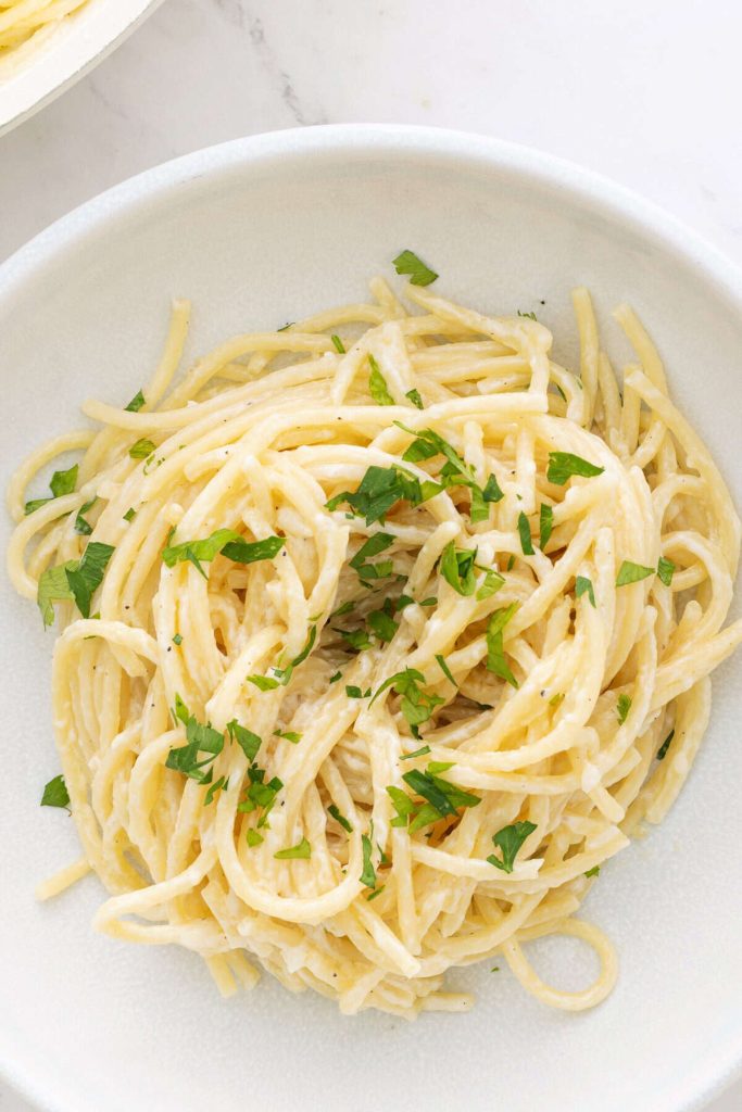 Creamy garlic pasta with parmesan and fresh parsley on a white plate, healthy comfortable food, easy vegan dinner, food recipe, gluten -free pasta.