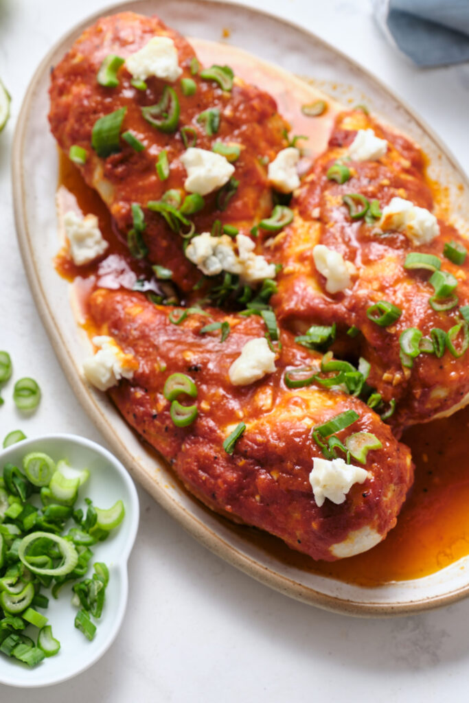 • Take away the dish from the oven and let the hen relaxation for five minutes earlier than serving. Garnish with inexperienced onions and probably a crumble of blue cheese.