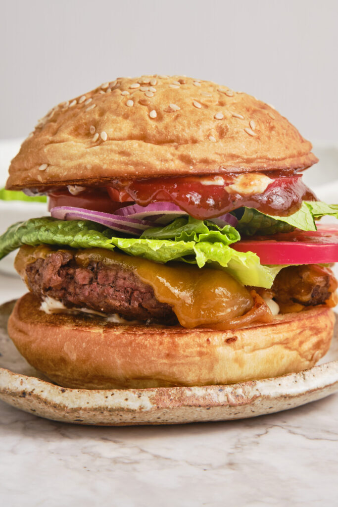I’d argue {that a} good burger is all about distinction and burgers can try this. It will get that stunning caramelized char on the skin, because of the burger press and the scorching pan. And for those who time every thing proper, your meat will stay completely juicy. Add your favourite cheese (my cheddar) together with all of your different favourite toppings for a year-round yard traditional.